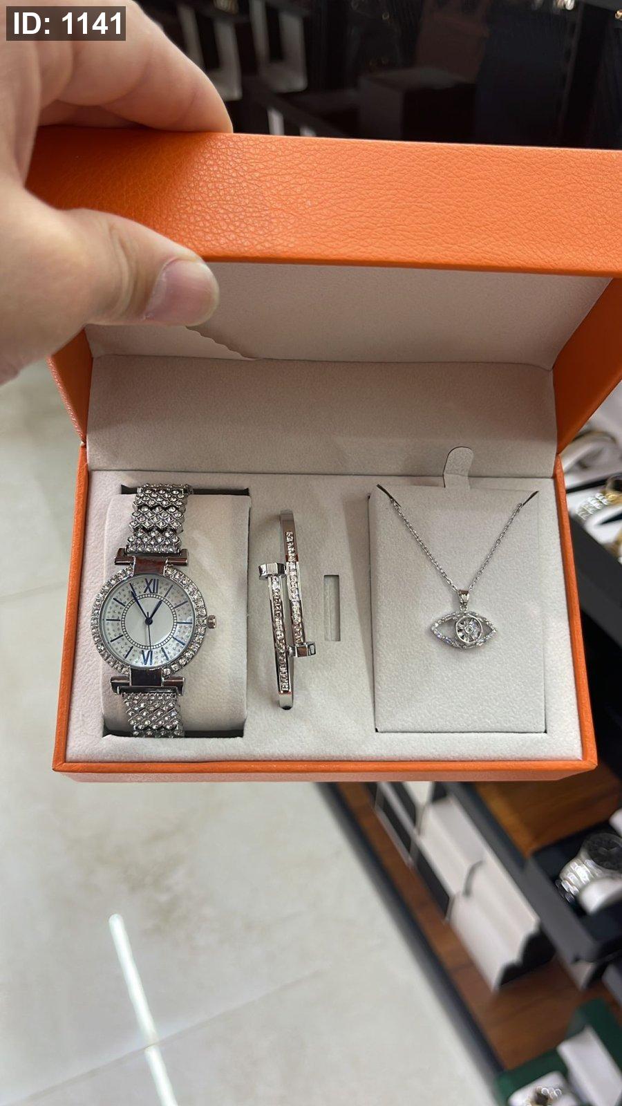 الطقم يحتوي على ( الصندوق , السنسال , الاسوارة , الساعة)