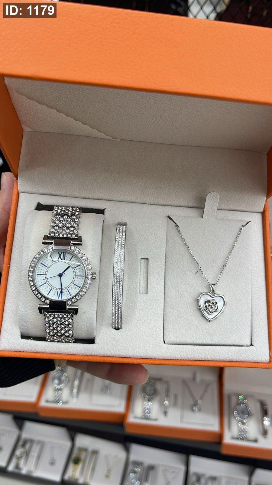 الطقم يحتوي على ( الصندوق , السنسال , الاسوارة , الساعة)