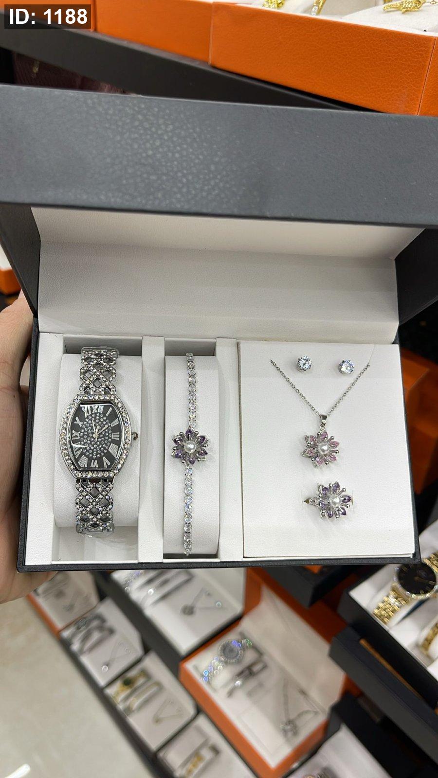 الطقم يحتوي على ( الصندوق , السنسال , الاسوارة , الساعة, الحلق)