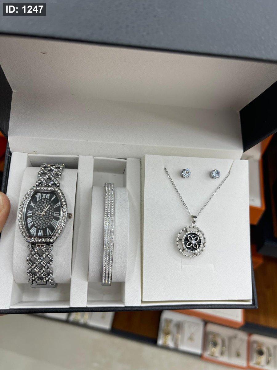 الطقم يحتوي على ( الصندوق , السنسال , الاسوارة , الساعة, الحلق)