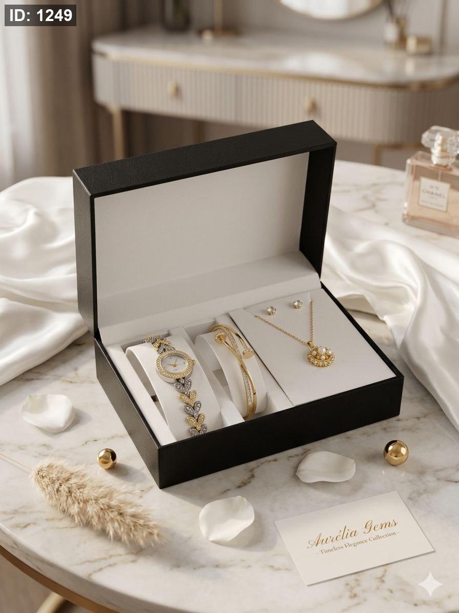 الطقم يحتوي على ( الصندوق , السنسال , الاسوارة , الساعة, الحلق)