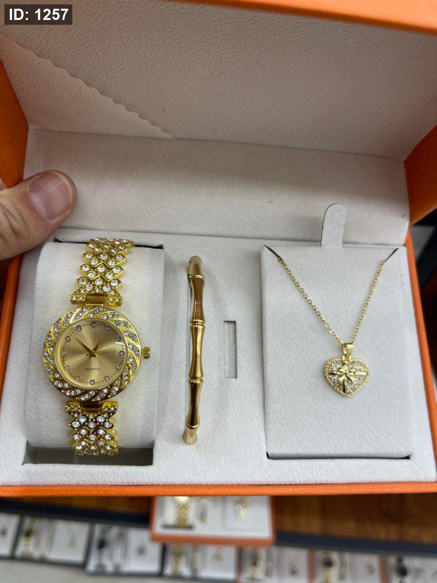 الطقم يحتوي على ( الصندوق , السنسال , الاسوارة , الساعة, الحلق)