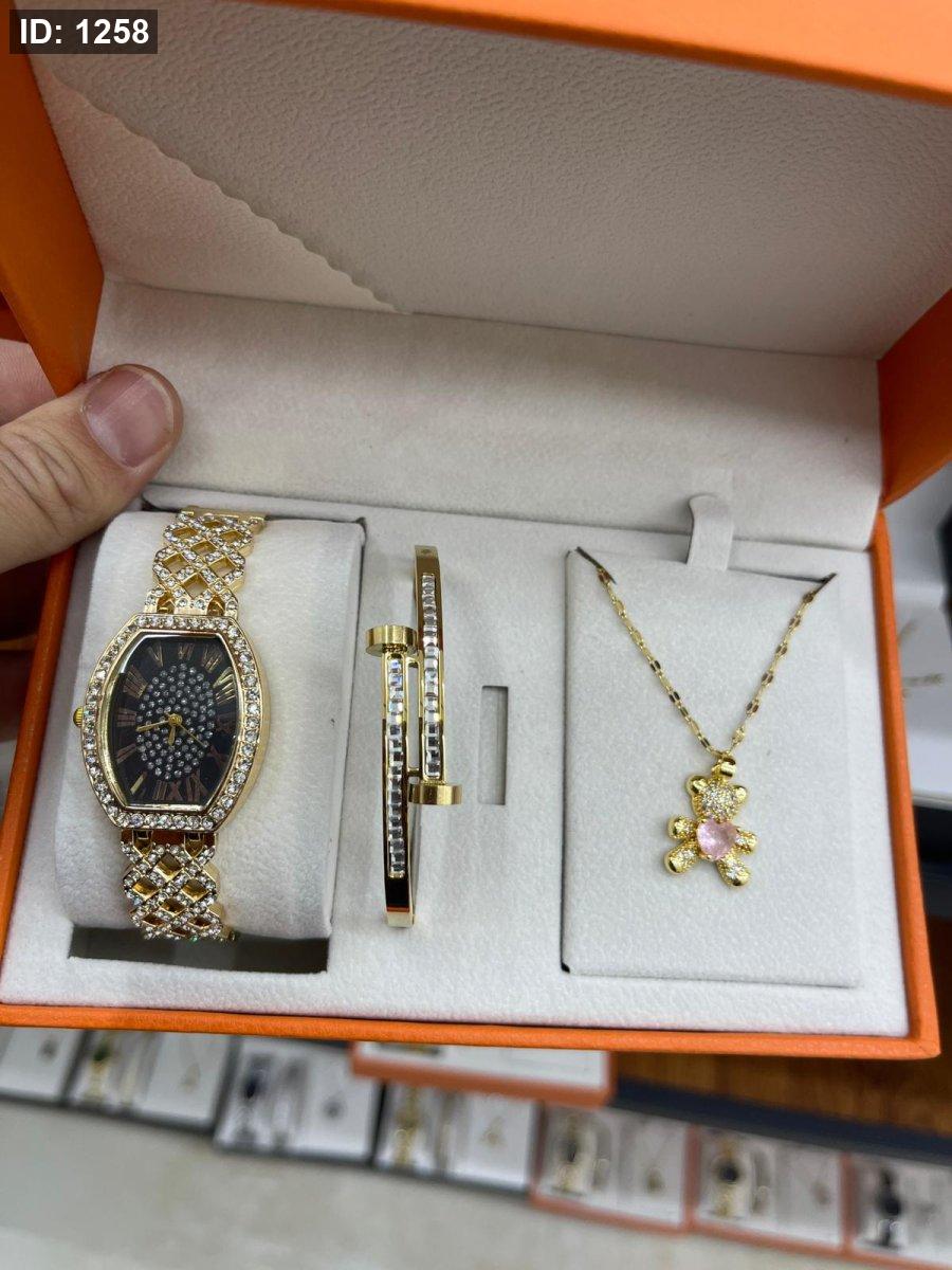 الطقم يحتوي على ( الصندوق , السنسال , الاسوارة , الساعة, الحلق)