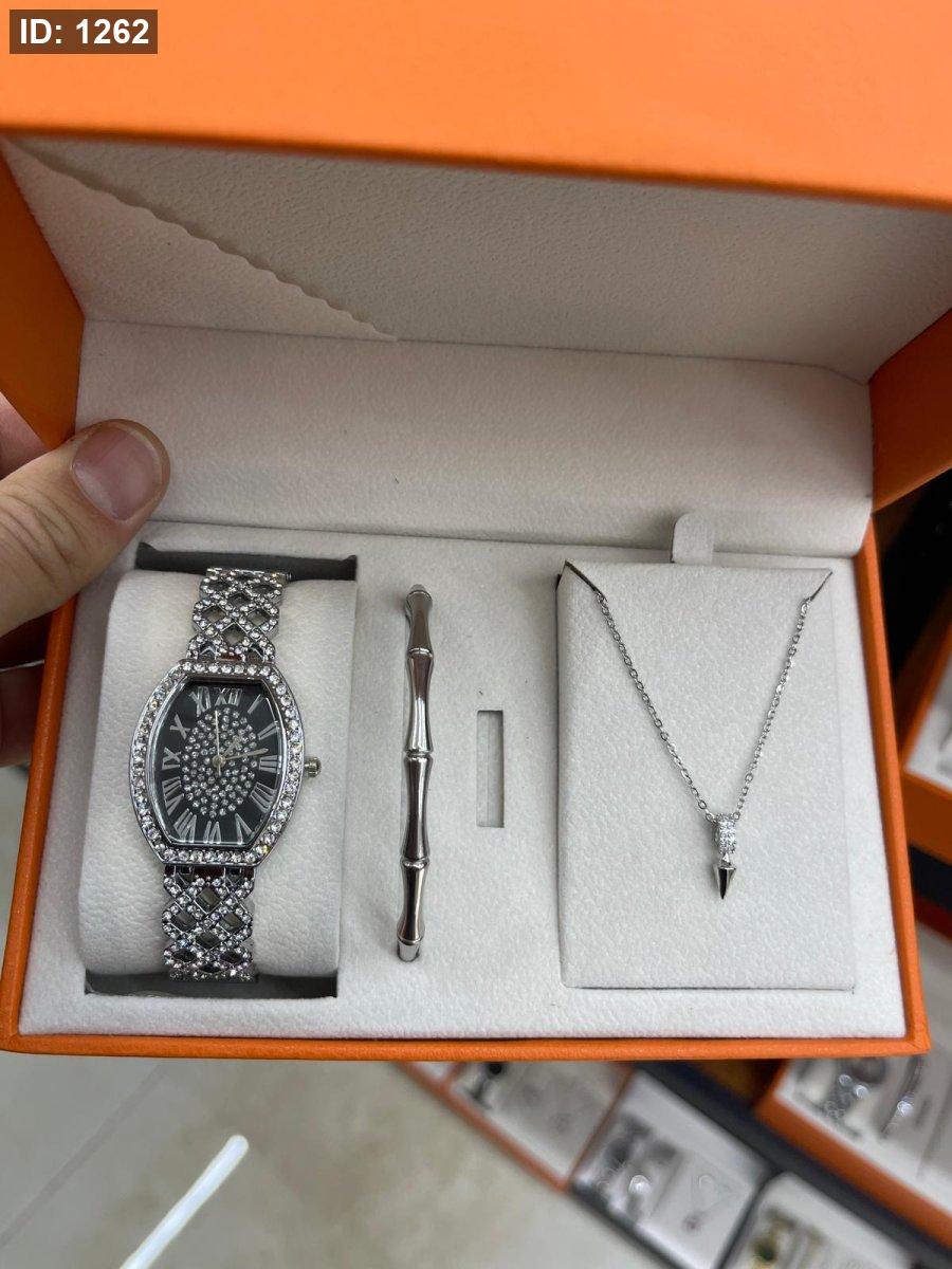 الطقم يحتوي على ( الصندوق , السنسال , الاسوارة , الساعة, الحلق)
