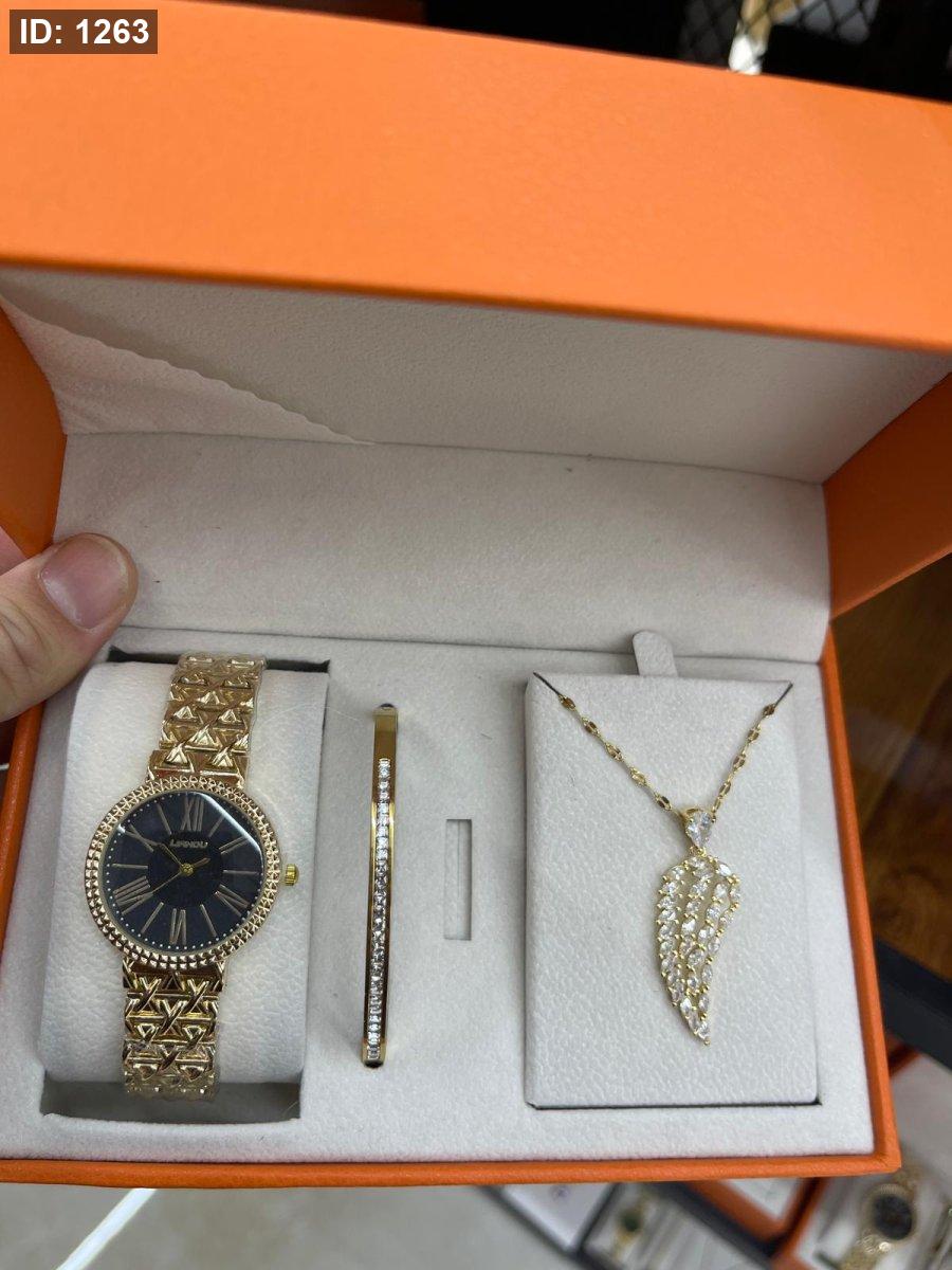 الطقم يحتوي على ( الصندوق , السنسال , الاسوارة , الساعة, الحلق)