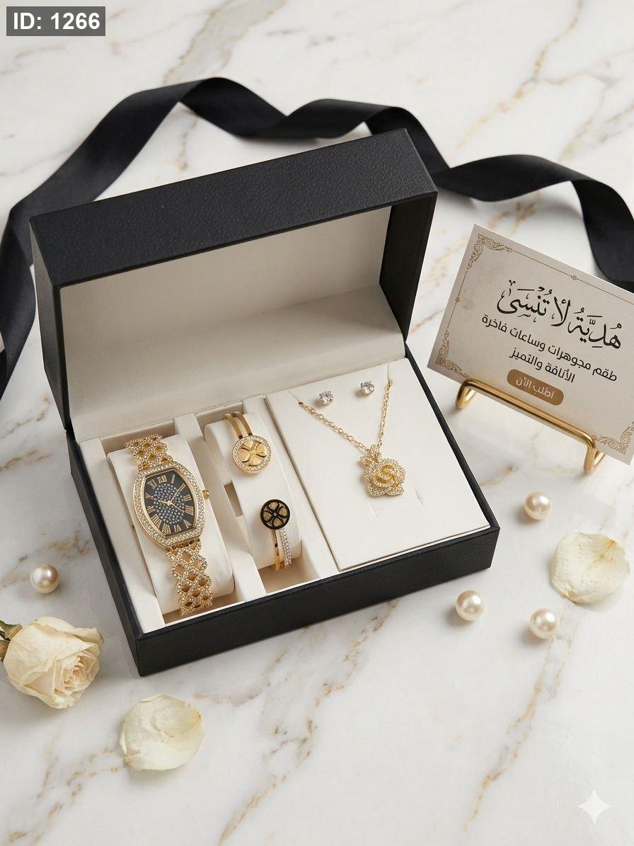 الطقم يحتوي على ( الصندوق , السنسال , الاسوارة , الساعة, الحلق)
