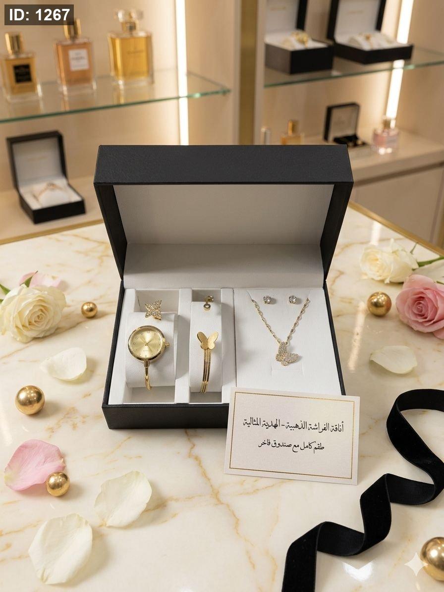 الطقم يحتوي على ( الصندوق , السنسال , الاسوارة , الساعة, الحلق)