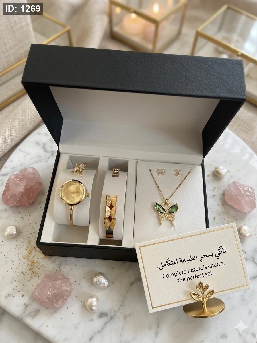 الطقم يحتوي على ( الصندوق , السنسال , الاسوارة , الساعة, الحلق)