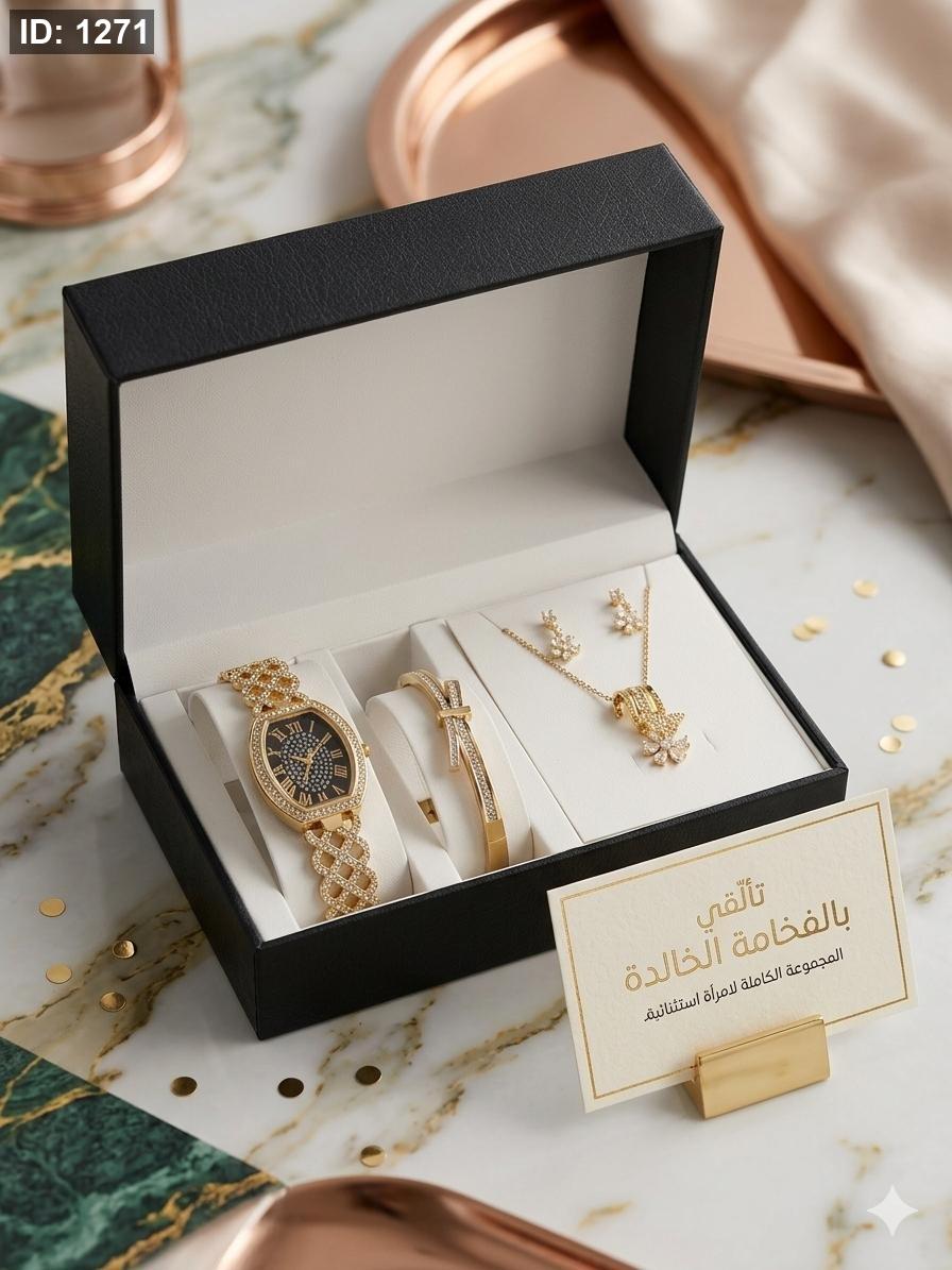 الطقم يحتوي على ( الصندوق , السنسال , الاسوارة , الساعة, الحلق)