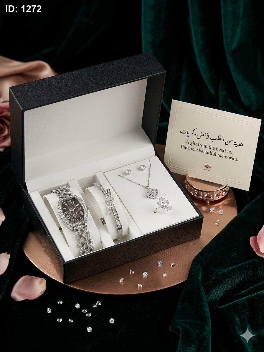 الطقم يحتوي على ( الصندوق , السنسال , الاسوارة , الساعة, الحلق)