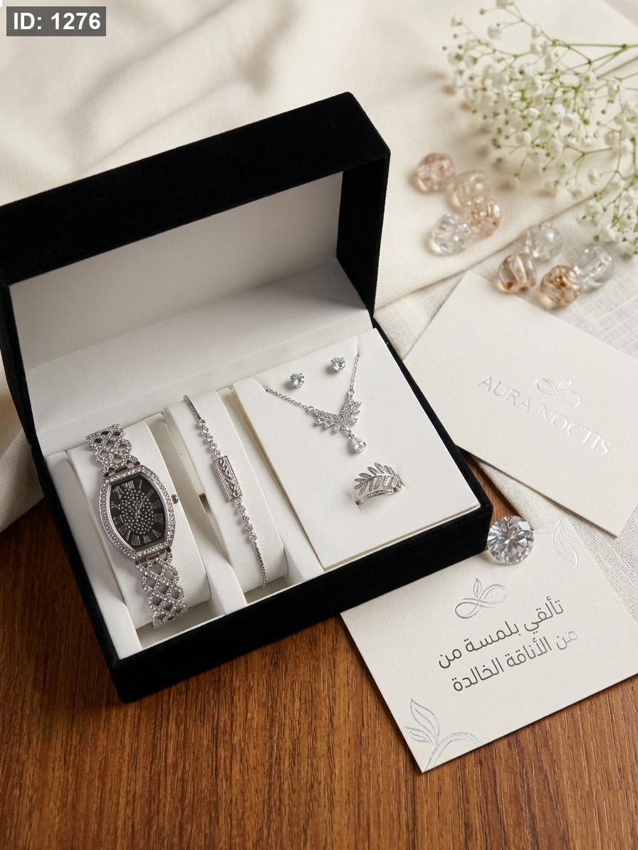 الطقم يحتوي على ( الصندوق , السنسال , الاسوارة , الساعة, الحلق)