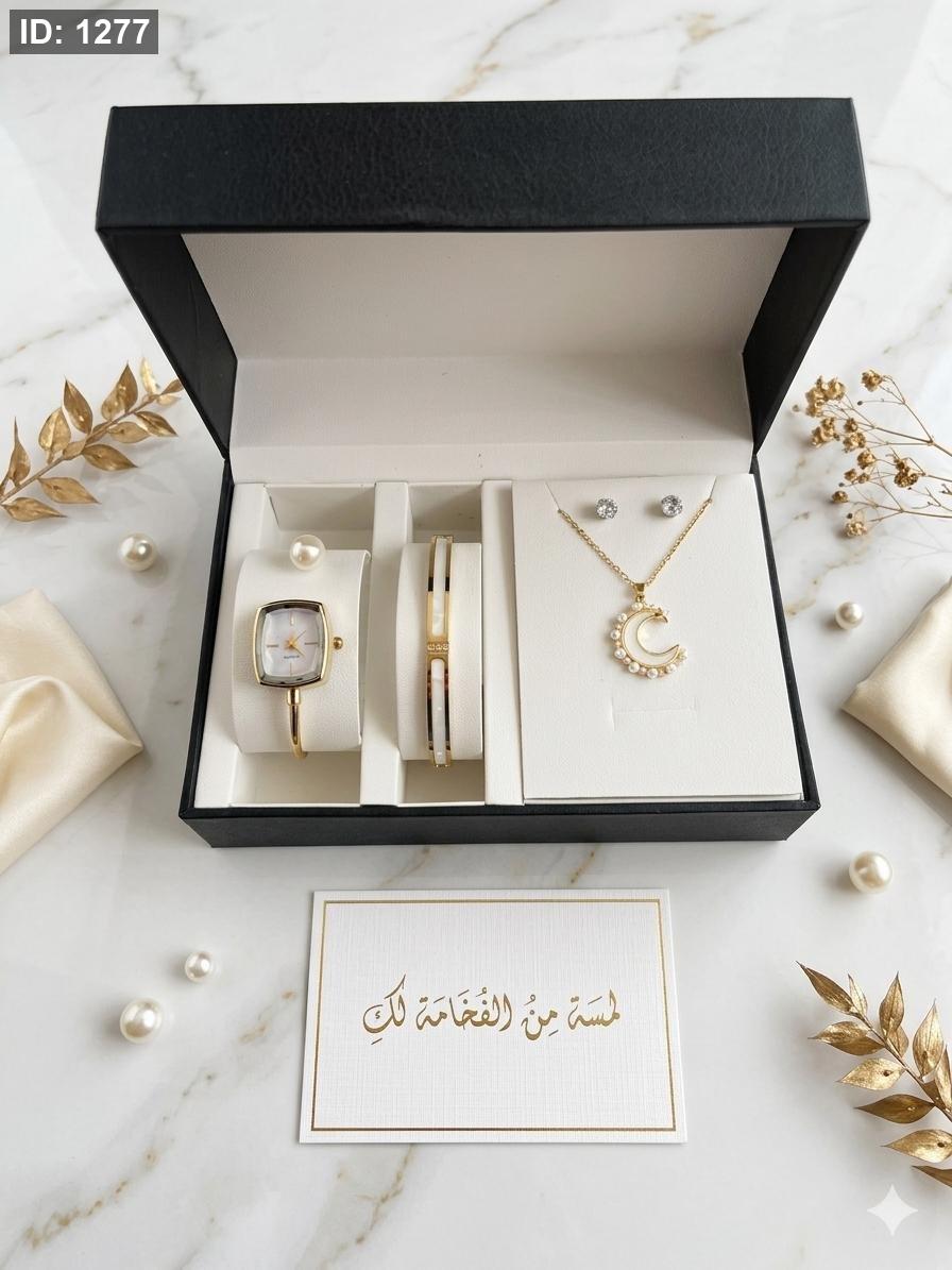 الطقم يحتوي على ( الصندوق , السنسال , الاسوارة , الساعة, الحلق)
