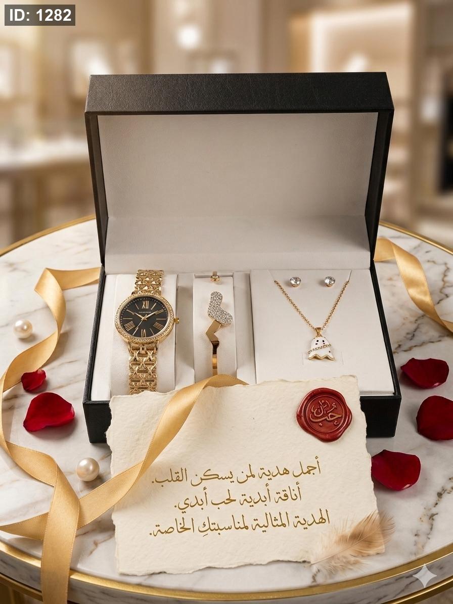 الطقم يحتوي على ( الصندوق , السنسال , الاسوارة , الساعة, الحلق)