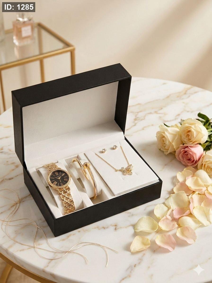 الطقم يحتوي على ( الصندوق , السنسال , الاسوارة , الساعة, الحلق)